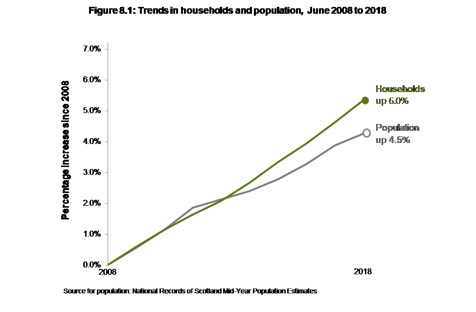 The number of households is increasing at a faster rate than the population. There were 2.48 million households in 2018 with 2.15 people per household. Average household size continues to slowly decrease, as the number of households increases at a faster rate than the population. One person households continue to be the most common type in Scotland (over one third of all households). This is partly because Scotland’s population is ageing, as older people are more likely to live alone or in smaller households.