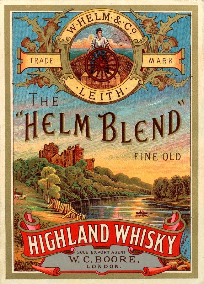 Bottling label for Helm Blend ‘fine old Highland whisky’ produced by W Helm & Co, Leith. The label is illustrated with a countryside scene of a castle set above a river bend, c 19th century. Crown copyright, NRS, CE57/4/50.