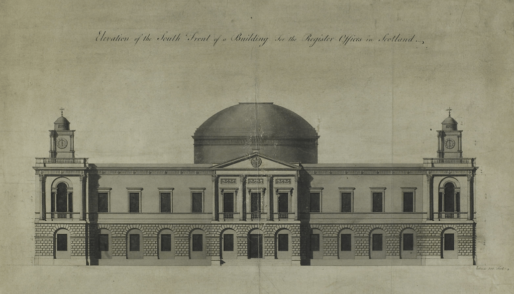 Designed by Robert Adam (1728-1792), GRH is one of his finest public buildings. It’s also the first purpose-built public record repository in the British Isles, and is one of the oldest archive buildings in the world still being used for its original purpose. It cost in total £29,000 to build. (Worth approximately over £2,500,000 in 2017 according to The National Archives currency converter).