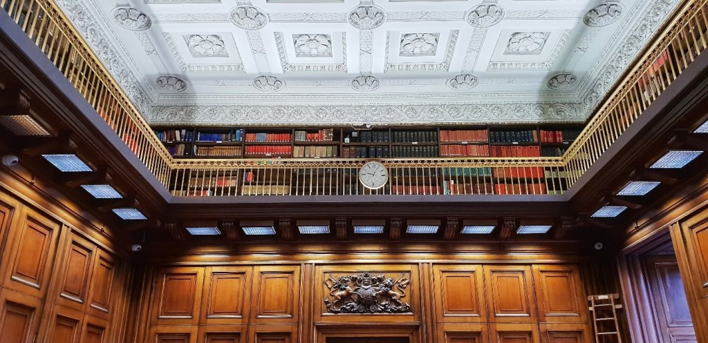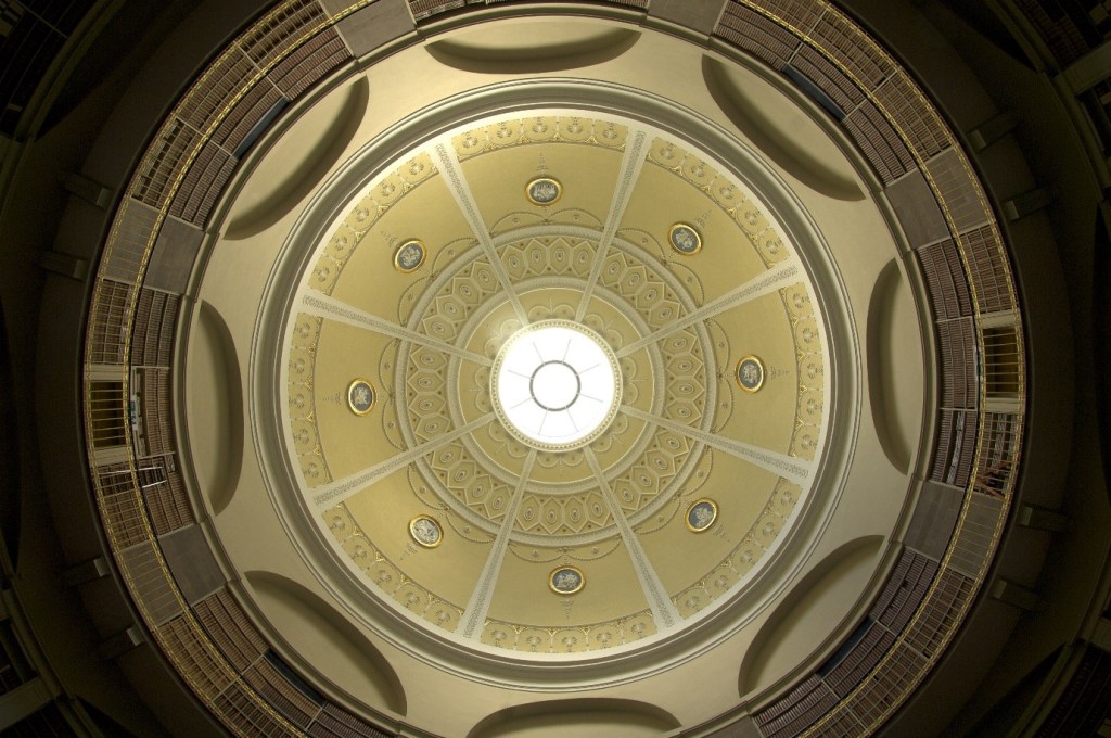 The main feature of this elegant building is the dome. Over 27 m (90 feet) high, it is of considerable interest as a piece of 19th century functional architecture and structural engineering. It comprises five tiers of ironwork shelving and galleries, similar to those at the British Museum in London. The central fireproof repository is surrounded on the outside by staff offices over three floors.