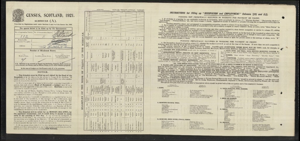 Reverse side of specimen sample of Schedule A, 1921 census, Scotland.