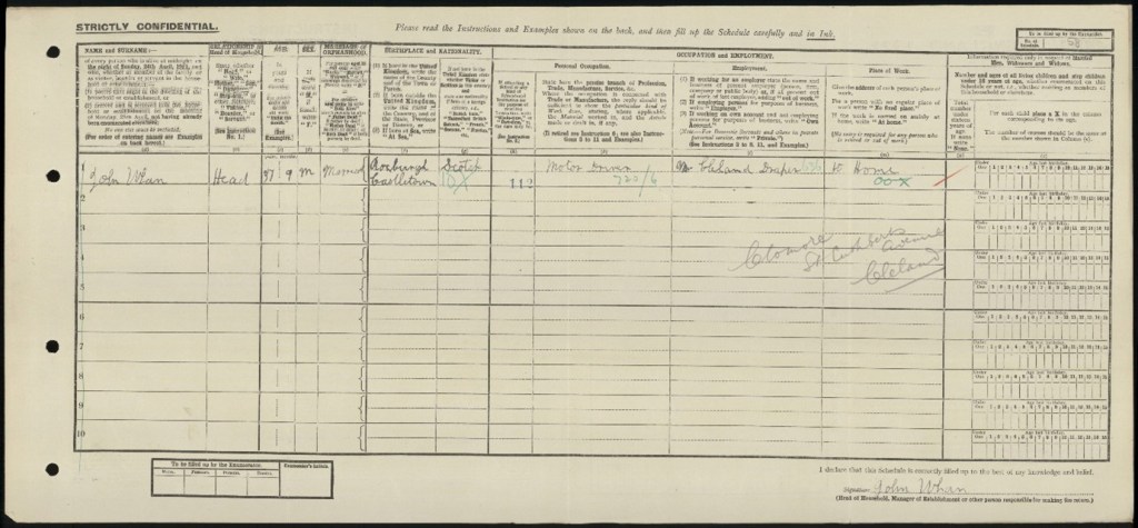 John was aged 37, married and from Roxburgh, Castletown. He describes himself as ‘Scotch’, employed as a ‘Motor Driver’ for ‘Mr Cleland Draper’. The schedule is signed by John. There is a note in pencil, not in his hand, which reads ‘Clonmore St Cuthberts Avenue Cleland’.