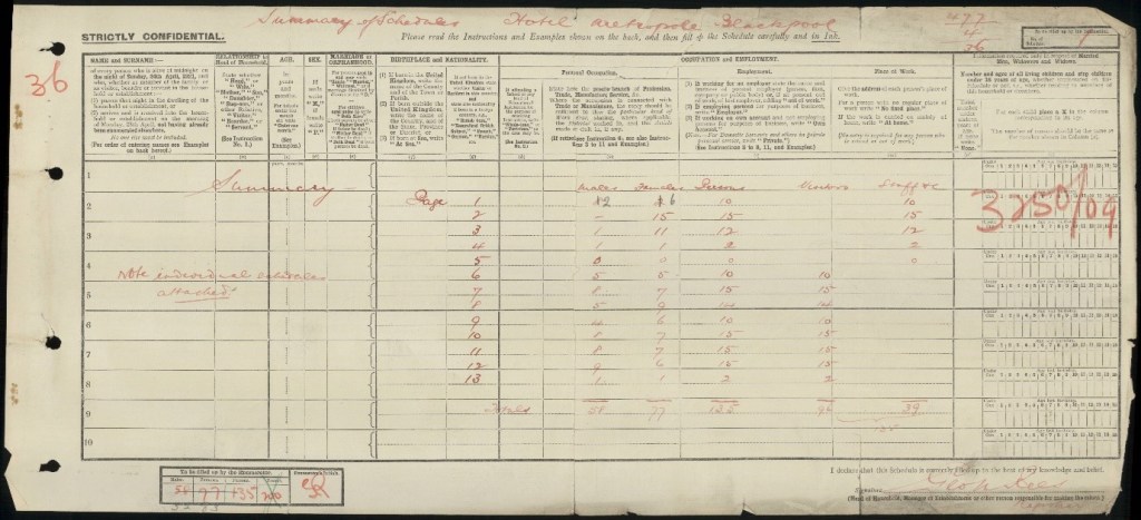 Summary of schedules for the Hotel Metropole, Blackpool, 1921 Census of England & Wales.