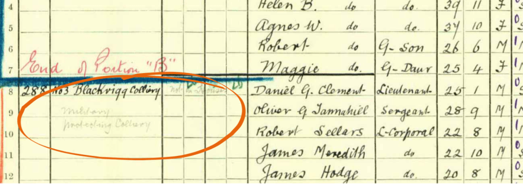 The census was taken during a coal strike which ended on 28 June and reveals that many military personnel were deployed to mines around the country. The entry for No 3 Blackrigg Colliery near Armadale in West Lothian gives only three words of explanation for why they were there.