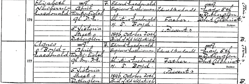 The entry includes twin girls Agnes and Elizabeth MacDonald, who were born in Rutherglen, Lanark.