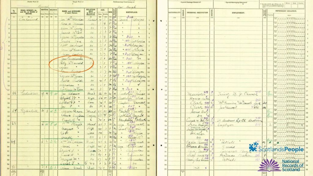 As well as the record in St Andrews we can see them recorded with their parents in Glasgow at 5 Lancefield Street, where their grandfather is head of the house. Six people living in a home with two rooms.