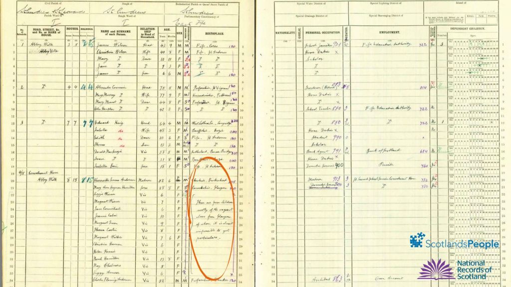 Another census entry from St Andrew’s, the Convalescent Home on Abbey Walk, includes an explanation for lack of some information: ‘These are poor children mostly of the vagrant class from Glasgow of whom it is almost impossible to get particulars’.