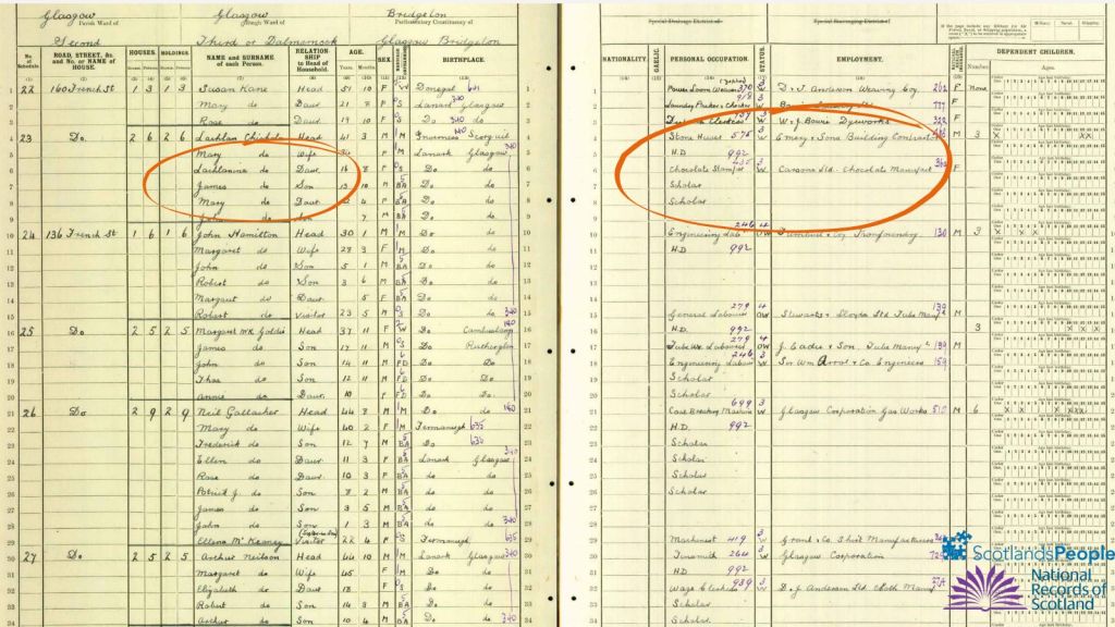 Lachlanina Chisholm was 16 when she was employed by Carsons Ltd, Chocolate Manufacturers as a ‘chocolate stamper’. Carsons were based in Bridgeton, close to where Lachlanina lived at 160 French Street. Some of her neighbours were work colleagues including Jessie Larkins who lived at 136 French Street and who was a ‘chocolate coverer’ and Elizabeth Roy who lived at 14 Trafalgar Street and her job was a ‘stamper up’.