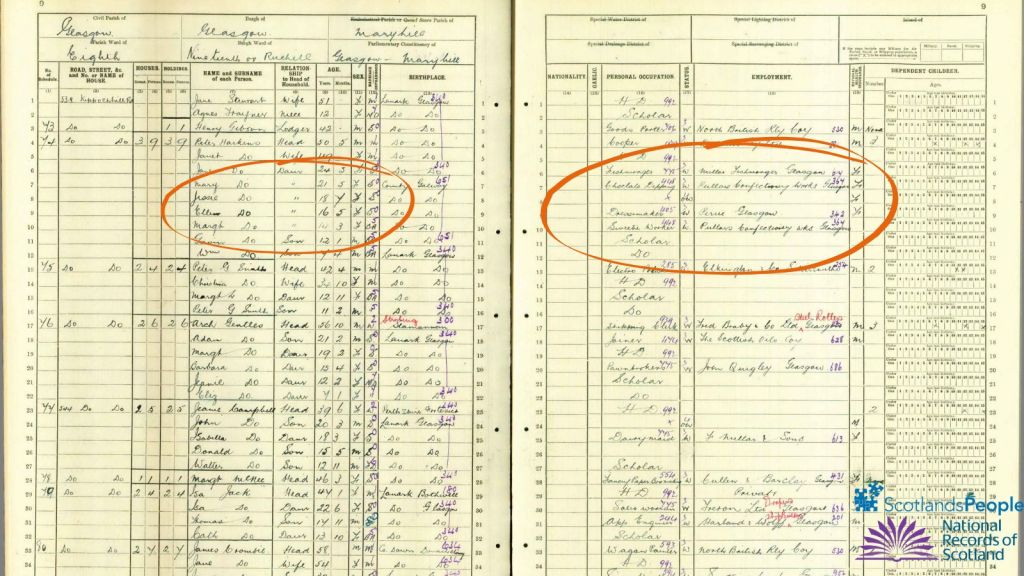 While sisters Mary (21) and Margaret Harkins (14) worked for Pullars Confectionary Works, Mary’s occupation was ‘chocolate dipping’ and Margaret a ‘sweetie worker’.
