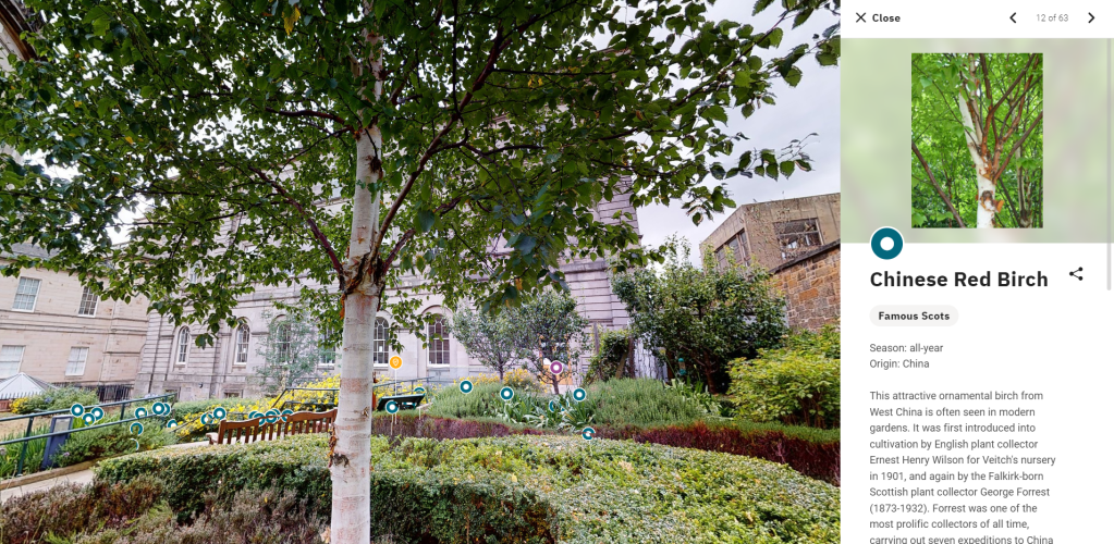 A digital scan of the garden has created a virtual version that allows visitors to explore the space remotely. Similar to Google street view, you can move through the space and click upon the ‘plant tags’ – depicted as circular dots – to explore why individual plants have been included.
