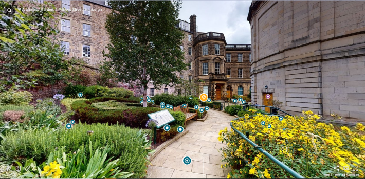You can hover and click on or touch the ‘circular dots’ to find out more about the plants and surrounding buildings. The plant ‘tags’ provide more information about each plant and why it was chosen for the garden as well as its connection to Scottish history and life.