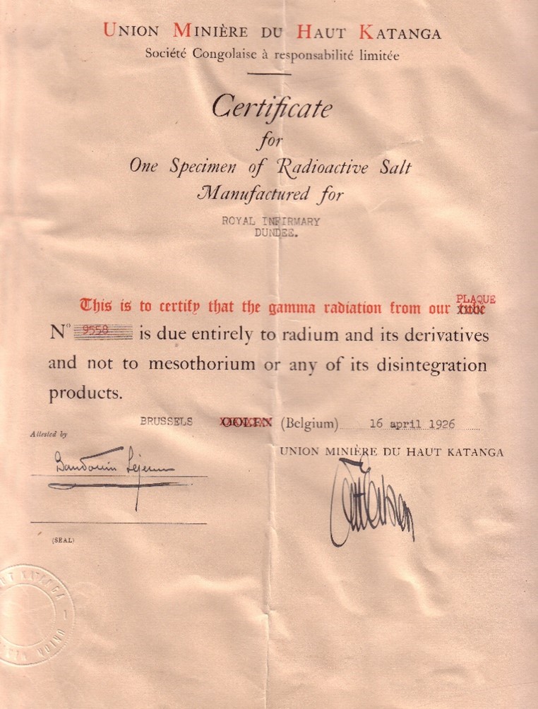 Certificate for radium used at Dundee Royal Infirmary, 1926