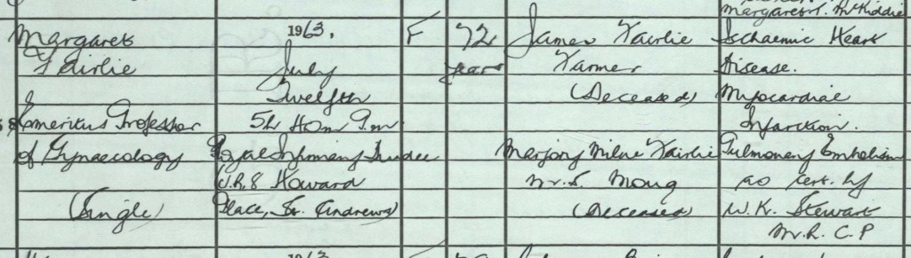 Professor Margaret Fairlie retired in 1956. At her retiral celebrations Margaret recalled her happy times and great ‘affection for Arbroath Infirmary. I have been happy at my work and I look back with gratitude to the loyalty and friendship I have received from the…staff…I will remember Miss Brander, a former matron, presiding over the tea-cups in the room… where the consultants and doctors discussed problems after a hard day’s work – and, perhaps, gossiped too! Another memory I have is of the superb sunsets seen from the top corridor at the Infirmary where I would pause to look out of the window on my way to an operation about 4pm on an autumn afternoon.’ (The Arbroath Guide, 13th October 1956).