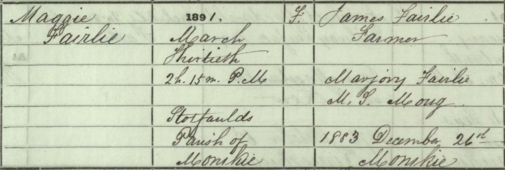 She was born to James and Marjory Fairlie, part of a family of well-established farmers in Stotfaulds in the parish of Monikie, Angus, on 30th March 1891. The 1891 census was taken just days after her birth, and she appears there unnamed as ‘under 1 month’. Margaret’s birth was registered by her father when she was two weeks old; recorded as ‘Maggie’ she appears under this name in the 1901 and 1911 census, before becoming known as ‘Margaret’ as an adult.