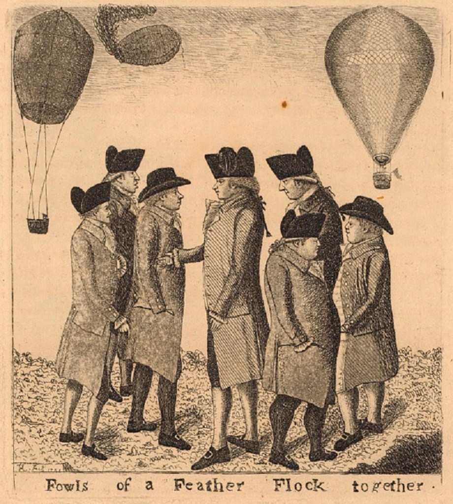 Tytler was not alone in his enthusiasm for the possibilities offered by air balloons as a means of human conveyance and by the early 1780s fully-fledged ‘balloon-mania’ had reached Britain. Newspaper reports of the period described the efforts of French balloonists such as the Montgolfier brothers and their successful ‘flying globe’ or ‘areostatick sphere’ constructed of ‘taffety, [taffeta]’ (Hereford Journal, 18 September 1783). The Montgolfier’s first unmanned flight took place in the summer of 1783. However, balloon technology developed quickly and experiments in France took place with animals in the balloon’s basket at Versailles Palace with King Louis XVI and Marie Antoinnette watching on. In October 1783 Etienne Montgolfier would be the first human to undertake a tethered balloon flight. ‘Balloon-mania’ also inspired hairstyles and fashions including balloon hats, dresses and even trousers.