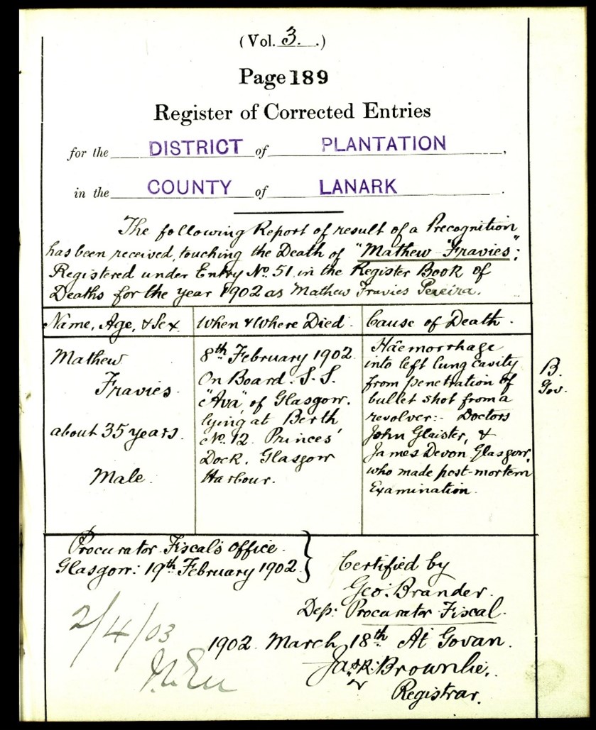Mathew Fravies’ death is recorded in the Statutory Register of Deaths (his name is given here as Mathew Fravies Pereira). The notes in the margin inform us that further investigation into his death (as undertaken in the post-mortem report) can be found in the Register of Corrected Entries: