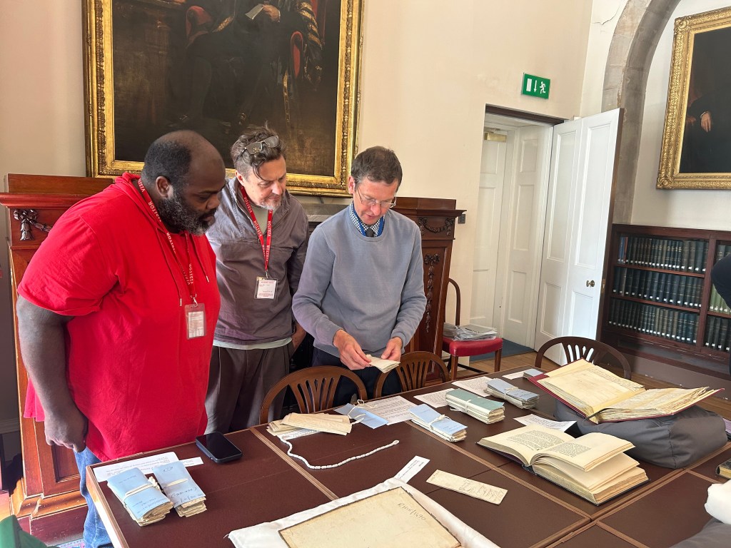 Photo description: Reggie, Ben and Alan exploring records of the Edinburgh Musical Society